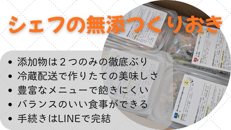 「シェフの無添つくりおき」が小さなお子様がいる家庭でも安心して利用できる内容をまとめた記事はこちら↓