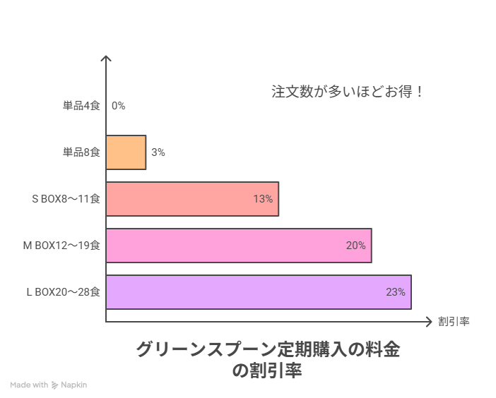 定期購入のほうが単品購入よりもお得な料金になる仕組みになっているので解説します。単品4食から7食は定価での購入になりますが、単品8食で3%オフ、S BOX(8~11食)で13%オフ、M BOX(12~19食)で20%オフ、L BOX(20~28食)で23%オフとなります。