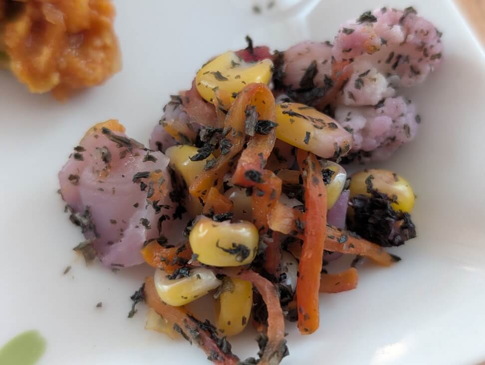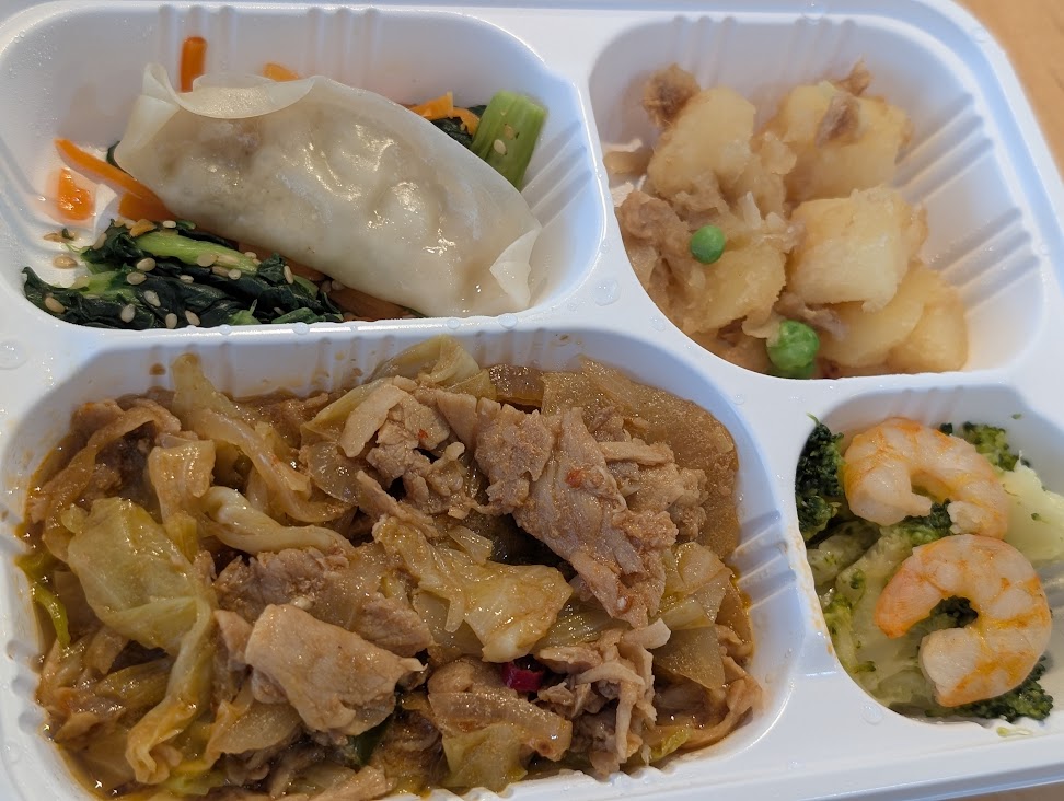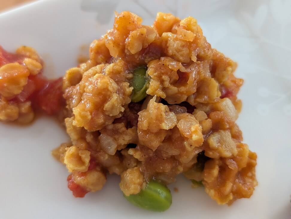 「クリームコロッケ」はエビの香りが広がり濃厚で高級感のある味でした。ボリュームのあるサイズで満足感もあり。副菜の「水晶鶏」と「カリフラワー」はさっぱりとしていて、箸休めにもなる味付けです。「大豆ミート」は、ひき肉と変わらない味わい。カレー味がクリームコロッケとの相性抜群です。