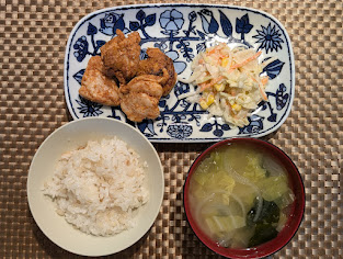 サバの竜田揚げにきのこたっぷりのポン酢ソースをかけて、副菜が2品。食べ応えのある贅沢な夕食となりました。マリネは小3の子供は酸っぱさが苦手であまり食べませんでした。