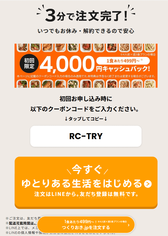 | 対象者 | つくりおき.jp初回注文者のみ |