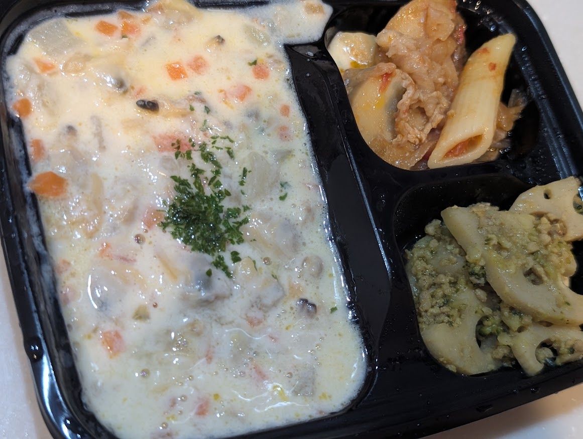 | 美幌峠牧場グラスフェッドミルクのクラムチャウダー | トマトとマッシュルームのパスタ カレー炒め | ![]() |
