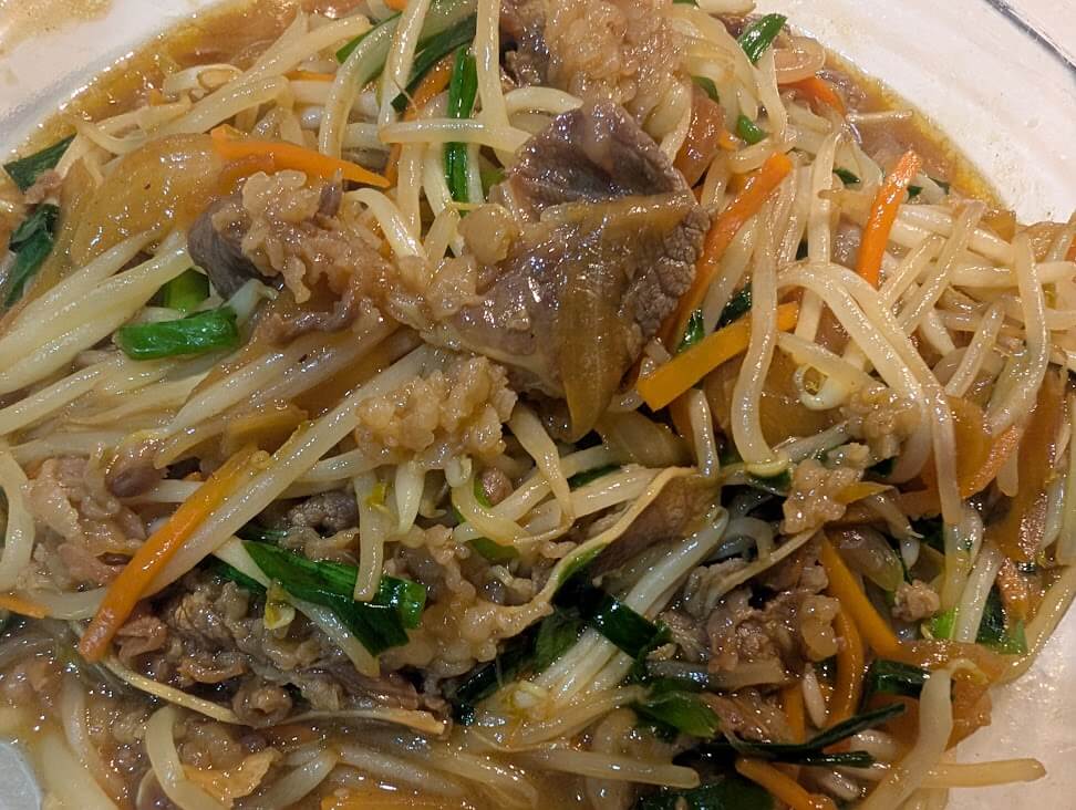 もやしは、洗わずに使えるタイプが届きます。にんじんはカット野菜、にらはキッチンバサミでざく切りにします。プルコギの素(牛肉と味付けたれ)と野菜を炒めるだけでメイン料理は完成。