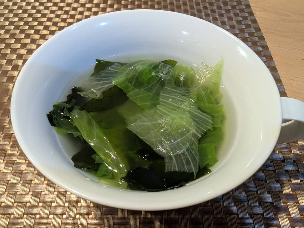 スープのレタスは手でちぎり、シュウマイはレンジで温めるだけ。簡単で楽ちんなメニューです。