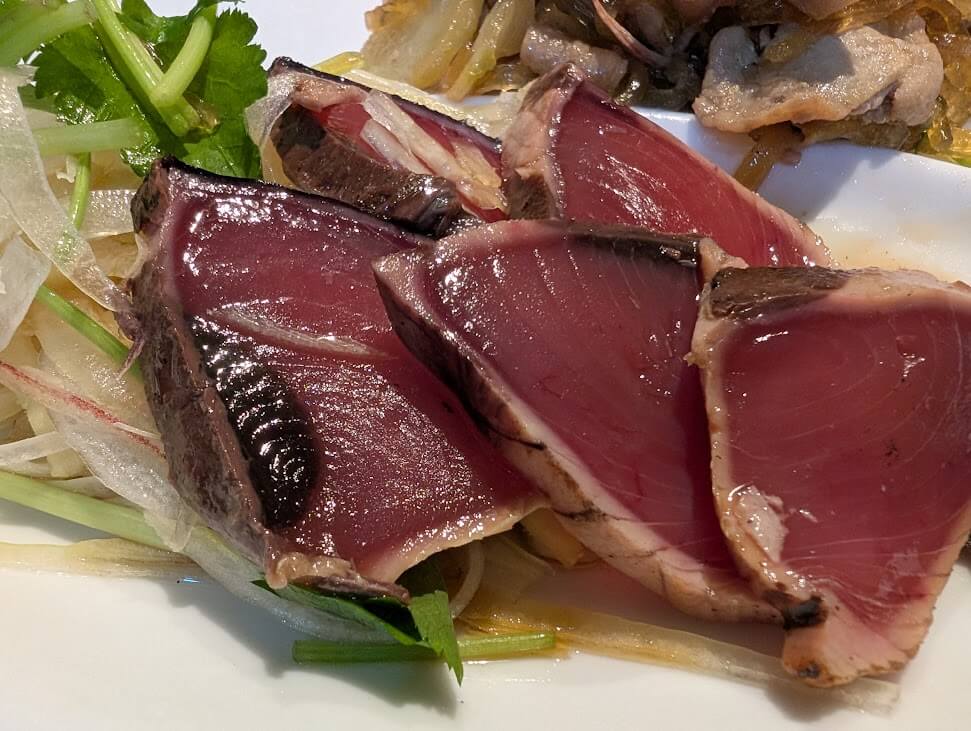 味付けは、かつおのたたきはポン酢。春雨炒めは砂糖・酒・しょうゆですが、レシピ通りだと味が濃いので少し少な目に調整しました。