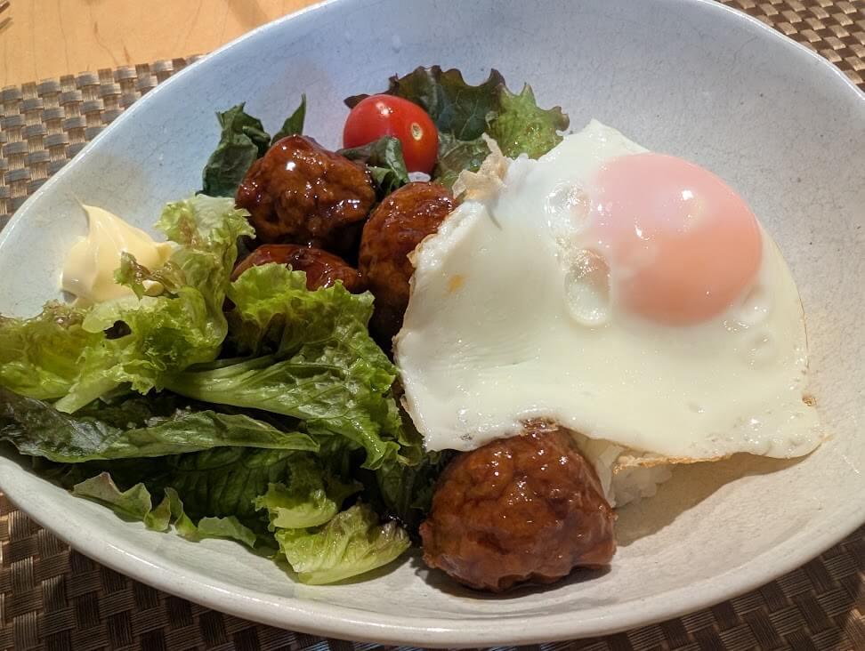 肉団子は冷凍のパウチを、湯せんで温めるだけ。目玉焼きを焼いて、レタスをちぎってトマトを添えだけでした。ごはんは、ミールキットには入っていないので、自宅で準備します。スープの写真を撮り忘れましたが、鶏がらスープの素で作ったスープに、鶏肉、カット済みたまねぎ、春雨を入れ、細ねぎをキッチンバサミで切ってきれるだけで完成でした。